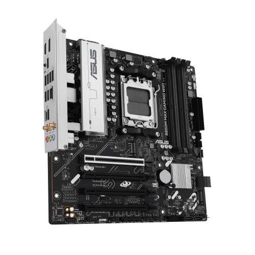 ASUS B850M MAX GAMING WIFI. Fabricante de procesador: AMD, Socket de procesador: Zócalo AM5, Procesador compatible: AMD Ryzen 7000 Series, AMD Ryzen 8000 Series, AMD Ryzen 9000 Series. tipos de memoria compatibles: DDR5-SDRAM, Memoria interna máxima: 256 GB, Tipo de ranuras de memoria: DIMM. Interfaces de disco de almacenamiento soportados: M.2, SATA III, Tipos de unidades de almacenamiento admitidas: HDD & SSD, Niveles RAID: 0, 1, 5, 10. Tipo de interfaz ethernet: Gigabit Ethernet, Estándar Wi-Fi: Wi-Fi 6 (802.11ax), Wi-Fi estándares: Wi-Fi 6 (802.11ax). Componente para: PC, Factor de forma: micro ATX, Familia del chipset: AMD