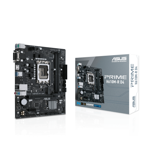 ASUS PRIME H610M-R D4. Fabricante de procesador: Intel, Socket de procesador: LGA 1700, Procesador compatible: Intel® Celeron®, Intel® Core™ i3, Intel® Core™ i5, Intel® Core™ i7, Intel® Core™ i9,.... tipos de memoria compatibles: DDR4-SDRAM, Memoria interna máxima: 64 GB, Tipo de ranuras de memoria: DIMM. Interfaces de disco de almacenamiento soportados: M.2, SATA III, Tipos de unidades de almacenamiento admitidas: HDD & SSD. Máxima resolución: 3840 x 2160 Pixeles. Conector USB: USB tipo A
