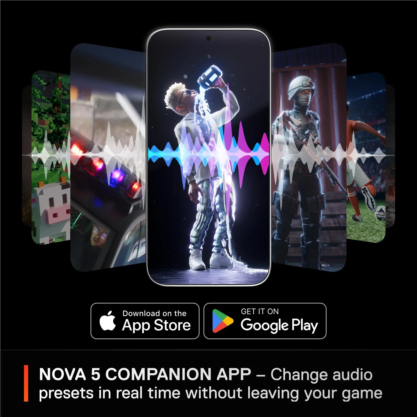 Arctis Nova 5 Companion App desbloquea más de 100 preajustes de sonido adaptados por profesionales de los deportes electrónicos e ingenieros de audio. Cambia entre perfiles de audio perfeccionados con precisión para los mejores juegos para resaltar los pasos y otros sonidos clave o aumentar la inmersión. Cambia los preajustes de audio en tiempo real sin salir del juego. Batería de 60 horas de duración. ¿Planea jugar toda la semana? Nuestra batería te ayuda. Con una carga completa que dura 8 horas cada día, es cinco veces más larga que la de otros auriculares. Además, la carga rápida USB-C proporciona 6 horas de carga en sólo 15 minutos. Conmutación inalámbrica rápida .Atiende llamadas fácilmente mientras juegas, cambiando de 2,4 GHz de alta velocidad a Bluetooth 5,3 con solo pulsar un botón. Las conexiones móviles permanecen en espera cuando vuelves a la acción, por lo que recibirás llamadas. Mantén tus ecualizadores de Fortnite en la banda de 2,4 GHz sin afectar a tus perfiles multimedia specíficos para audio Bluetooth. Transductores magnéticos de neodimio .Escucha todo con un paisaje sonoro ultra detallado de agudos nítidos, medios precisos y graves profundos. Los transductores magnéticos de neodimio de diseño personalizado, fabricados con un metal de tierras raras, garantizan una experiencia de audio perfecta, sea cual sea el juego o la pista que estés reproduciendo. Micrófono ClearCaZst 2.X 2 veces más ancho de banda, 2 veces más claridad con nuestro nuevo micrófono ClearCast y un nuevo chipset de gran ancho de banda compatible con audio de 32KHz/16Bit. Potencie aún más su voz con la cancelación de ruido por IA Sonar en PC, para disfrutar de la reducción de ruido bidireccional definitiva en las comunicaciones. Retraiga completamente el micrófono para una comodidad elegante.