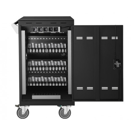 Con el carro de carga AVER E32cPlus para 32 portátiles/Chromebooks/tabletas de hasta 15,6 pulgadas, cargar y transportar sus dispositivos de A a B es un juego de niños.