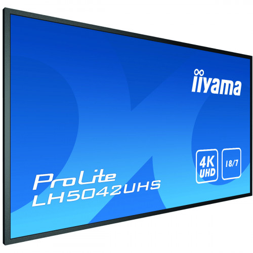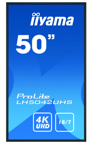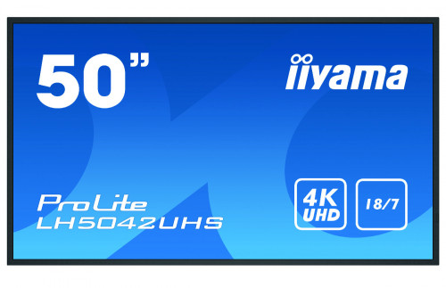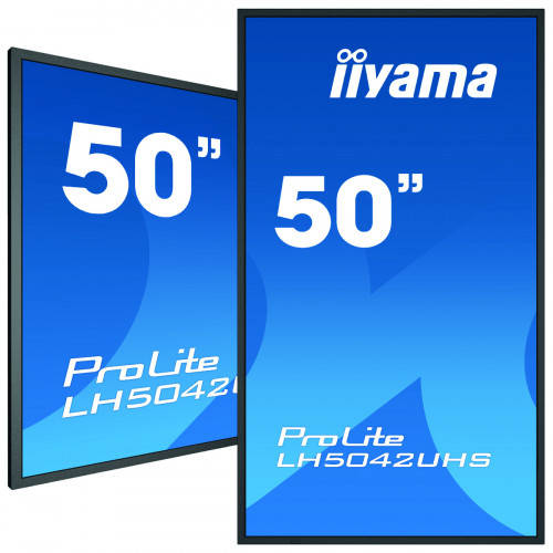 iiyama LH5042UHS-B3. Diagonal de la pantalla: 125,7 cm (49.5″), Tecnología de visualización: VA, Resolución de la pantalla: 3840 x 2160 Pixeles. Potencia estimada RMS: 20 W. Diseño de producto: Pizarra de caballete digital, Color del producto: Negro, Colocación soportada: Interior. Utilizar con: Universal, Horas de funcionamiento (horas/días): 18/7, Tiempo medio entre fallos: 50000 h. Consumo energético: 147 W, Consumo de energía (inactivo): 0,5 W, Consumo de energía (apagado): 0,5 W