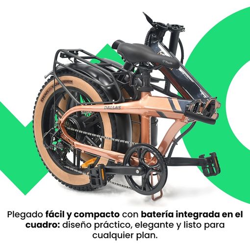Domina asfalto y caminos difíciles con la YOUIN Dallas BK1650, la e-bike FAT plegable hecha para quienes exigen máximo rendimiento y fiabilidad. Características YOUIN Dallas BK1650 Fat plegable Versatilidad total: Su potente motor trasero de 250W (52 Nm) y batería extraíble integrada permiten alcanzar hasta 60 km reales de autonomía bajo condiciones urbanas reales, asegurando desplazamientos diarios y escapadas puntuales sin restricciones. Rendimiento FAT auténtico: Ruedas ultraanchas de 20″ y horquilla de suspensión de 80 mm absorben las irregularidades del terreno, facilitando tanto trayectos urbanos como rutas sobre caminos exigentes o superficies inestables. Montaje y portabilidad premium: Chasis de aluminio ligero plegable llega preinstalada al 95% para que solo tengas que ajustar sillín y manillar. Olvídate de ensamblajes complejos en minutos estarás rodando. Control, seguridad y confort: Disfruta de frenos de disco hidráulicos, pantalla a color de alto contraste y equipamiento superior: cesta delantera.