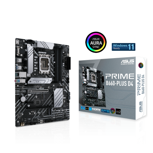 ASUS PRIME B660-PLUS D4. Fabricante de procesador: Intel, Socket de procesador: LGA 1700, Procesador compatible: Intel® Celeron®, Intel® Core™ i3, Intel Core i5, Intel Core i7, Intel Core i9, Intel® Pentium® Gold. tipos de memoria compatibles: DDR4-SDRAM, Memoria interna máxima: 128 GB, Tipo de ranuras de memoria: DIMM. Interfaces de disco de almacenamiento soportados: M.2,PCI Express 4.0,SATA III, Tipos de unidades de almacenamiento admitidas: HDD & SSD. Conector USB: USB tipo A, USB Tipo C. Tipo de interfaz ethernet: 2.5 Gigabit Ethernet