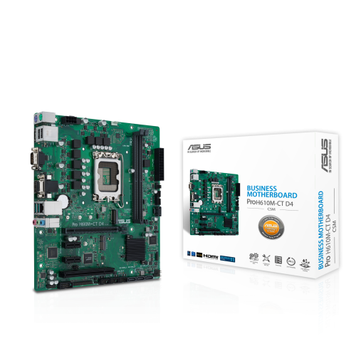 ASUS PRO H610M-CT D4-CSM. Fabricante de procesador: Intel, Socket de procesador: LGA 1700, Procesador compatible: Intel® Celeron®, Intel® Core™ i3, Intel® Core™ i5, Intel® Core™ i7, Intel® Core™ i9,…. tipos de memoria compatibles: DDR4-SDRAM, Memoria interna máxima: 64 GB, Tipo de ranuras de memoria: DIMM. Interfaces de disco de almacenamiento soportados: M.2, SATA III, Tipos de unidades de almacenamiento admitidas: HDD & SSD. Tipo de interfaz ethernet: Gigabit Ethernet. Componente para: PC, Factor de forma: micro ATX, Familia del chipset: Intel