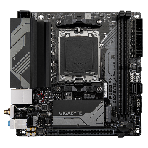 GIGABYTE A620I AX. Fabricante de procesador: AMD, Socket de procesador: Zócalo AM5, Procesador compatible: AMD Ryzen 7000 Series. tipos de memoria compatibles: DDR5-SDRAM, Memoria interna máxima: 96 GB, Tipo de ranuras de memoria: DIMM. Interfaces de disco de almacenamiento soportados: M.2, SATA III, Tipos de unidades de almacenamiento admitidas: HDD & SSD, Niveles RAID: 0, 1. Máxima resolución: 4096 x 2160 Pixeles. Conector USB: USB tipo A, USB Tipo C