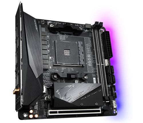 Gigabyte B550I AORUS PRO AX. Fabricante de procesador: AMD, Socket de procesador: Zócalo AM4, Procesador compatible: AMD Ryzen 3 3rd Gen, 3rd Generation AMD Ryzen 5, 3rd Generation AMD Ryzen 7, 3rd Generation AMD…. tipos de memoria compatibles: DDR4-SDRAM, Tipo de ranuras de memoria: DIMM, Velocidades de reloj de memoria soportadas: 2133,2400,2667,2933,3200,3333,3600,4000,4400,4600,5000 MHz. Memoria máxima de adaptador de gráficos: 16000 MB, Máxima resolución: 5120 x 2880 Pixeles. Tipo de interfaz ethernet: 2.5 Gigabit Ethernet, Wi-Fi estándares: 802.11a,802.11b,802.11g,Wi-Fi 4 (802.11n),Wi-Fi 5 (802.11ac),Wi-Fi 6 (802.11ax). Componente para: Nettop, Factor de forma: mini ITX, Familia del chipset: AMD