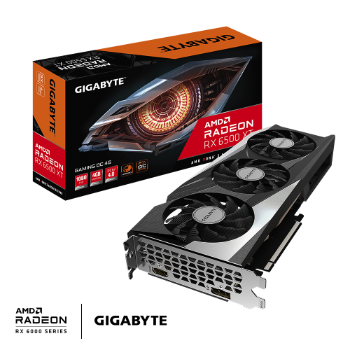 Gigabyte Radeon RX 6500 XT GAMING OC 4G. Familia de procesadores de gráficos: AMD, Procesador gráfico: Radeon RX 6500 XT. Capacidad memoria de adaptador gráfico: 4 GB, Tipo de memoria de adaptador gráfico: GDDR6, Ancho de datos: 64 bit, Velocidad de memoria del reloj: 18000 MHz. Máxima resolución: 7680 x 4320 Pixeles. Versión DirectX: 12 Ultimate, Versión OpenGL: 4.6. Tipo de interfaz: PCI Express 4.0. Tipo de enfriamiento: Activo, Número de ventiladores: 3 Ventilador(es)