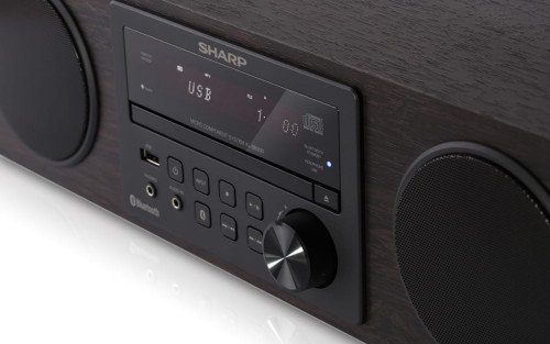 Sharp ALL-IN-ONE HI-FI Sound System. Tipo: Microcadena de música para uso doméstico, Color del producto: Marrón. Potencia estimada RMS: 100 W, Tipo de altavoces: De 2 vías, Tipo de conectividad de bocina: Inalámbrico. Bandas de radio soportadas: FM. Control de volumen: Giratorio. Fuente de energía: Corriente alterna, Consumo energético: 25 W, Consumo de energía (inactivo): 0,4 W