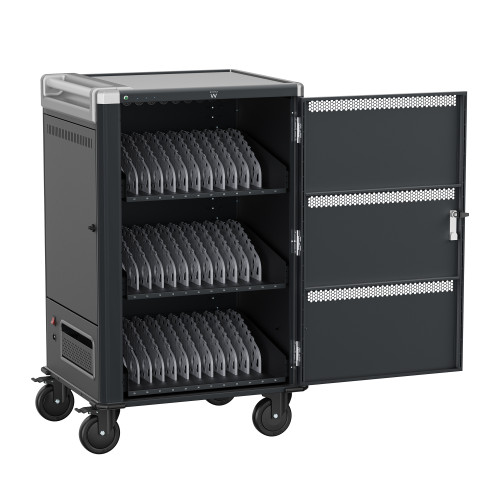 El carro de carga EW1701 le permite proteger, almacenar y cargar fácilmente hasta 36 dispositivos Tablets, Chromebook o portátiles con pantallas de hasta 15.6". Cuenta con un sistema de carga inteligente, estantes con ranuras para dispositivos flexibles y duraderas, un sistema de administración de cables/fuente de alimentación y, lo mejor de todo, está completamente ensamblado para una implementación rápida. Además, cuenta con espacios numerados para dispositivos y sus correspondientes espacios para suministro de energía para optimizar la organización. El carro también cuenta con puertas ventiladas con un mecanismo de bloqueo con llave de 3 puntos y la opción de agregar su propio candado para mayor seguridad.