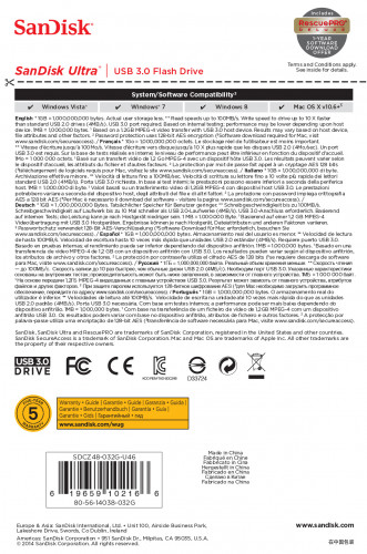 Sandisk Ultra. Capacidad: 32 GB, Interfaz del dispositivo: USB tipo A, Versión USB: 3.2 Gen 1 (3.1 Gen 1), Velocidad de lectura: 100 MB/s. Factor de forma: Deslizar. Protección mediante contraseña. Peso: 13,61 g. Color del producto: Negro