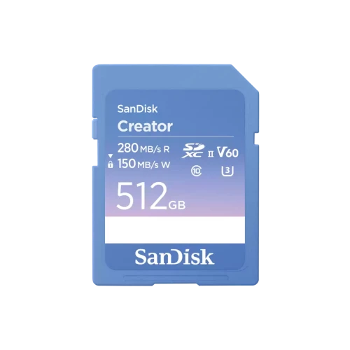 SanDisk Creator. Capacidad: 512 GB, Tipo de tarjeta flash: SDXC, Clase de memoria flash: Clase 10, Tipo de memoria interna: UHS-II, Velocidad de lectura: 280 MB/s, Velocidad de escritura: 150 MB/s, Clase de velocidad UHS: Class 3 (U3), Clase de velocidad de vídeo: V60. Color del producto: Azul