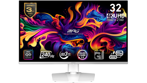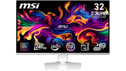 MSI MPG 321URXW QD-OLED. Diagonal de la pantalla: 80 cm (31.5″), Resolución de la pantalla: 3840 x 2160 Pixeles, Tipo HD: 4K Ultra HD, Tecnología de visualización: QD-OLED, Tiempo de respuesta: 0,03 ms, Relación de aspecto nativa: 16:9, Ángulo de visión, horizontal: 178°, Ángulo de visión, vertical: 178°. Conector USB incorporado. montaje VESA, Ajustes de altura. Color del producto: Blanco