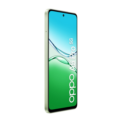 OPPO A5 Pro 5G. Diagonal de la pantalla: 16,9 cm (6.67″), Resolución de la pantalla: 1604 x 720 Pixeles. Frecuencia del procesador: 2,4 GHz, Familia de procesador: MediaTek Dimensity, Modelo del procesador: 6300. Capacidad de RAM: 8 GB, Tipo de RAM: LPDDR4X, Capacidad de almacenamiento interno: 256 GB. Resolución de la cámara trasera (numérica): 50 MP, Tipo de cámara trasera: Cámara doble. Capacidad de la tarjeta SIM: SIM doble. Sistema operativo instalado: Android 15. Capacidad de batería: 5800 mAh. Color del producto: Verde, Oliva. Peso: 194 g