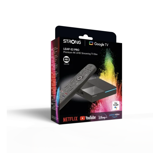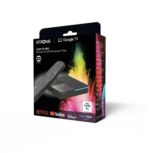 Strong LEAP-S3 PRO. Tipo HD: 4K Ultra HD, Sistema operativo instalado: Android, Máxima resolución de video: 3840 x 2160 Pixeles. Interfaz del dispositivo: HDMI, Wi-Fi estándares: 802.11a, 802.11b, 802.11g, Wi-Fi 4 (802.11n), Wi-Fi 5 (802.11ac), Wi-Fi 6 (802.11ax). Fuente de energía: Adaptador de CA, Voltaje de entrada DC: 12 V. Color del producto: Negro. Capacidad de almacenamiento interno: 32 GB, Unidad de almacenamiento: eMMC
