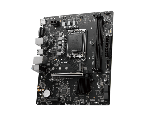 MSI PRO H610M-E. Fabricante de procesador: Intel, Socket de procesador: LGA 1700, Procesador compatible: Intel® Celeron®, Intel® Core™ i3, Intel® Core™ i5, Intel® Core™ i7, Intel® Core™ i9,.... tipos de memoria compatibles: DDR5-SDRAM, Memoria interna máxima: 96 GB, Tipo de ranuras de memoria: DIMM. Interfaces de disco de almacenamiento soportados: M.2, SATA III, Tipos de unidades de almacenamiento admitidas: HDD & SSD, Niveles RAID: 0, 1, 5, 10. Tipo de interfaz ethernet: 2.5 Gigabit Ethernet. Componente para: PC, Factor de forma: micro ATX, Familia del chipset: Intel
