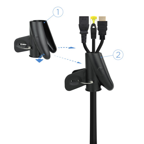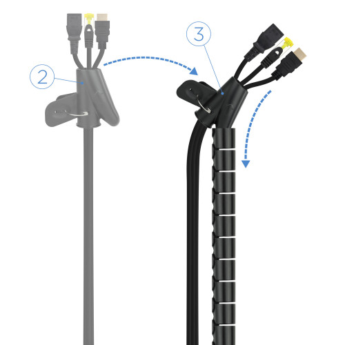 Organizador de cables negro y elegante, perfecto para cualquier estancia y situación.Se coloca el adaptador con la flecha hacia arriba y se abre ubicando los cables en su interior.Se introduce el adaptador con los cables por un extremo del organizador.Se desliza el adaptador a lo largo de todo el organizador, dejando a su paso los cables dentro.El organizador de cables es perfecto para recoger los cables de manera práctica y sencilla en cualquier entorno. Gracias a su composición flexible y resistente de un metro de longitud y un diámetro de 25 mm otorga una fácil y rápida instalación, dejando como resultado los cables ordenados y disimulados en su interior.