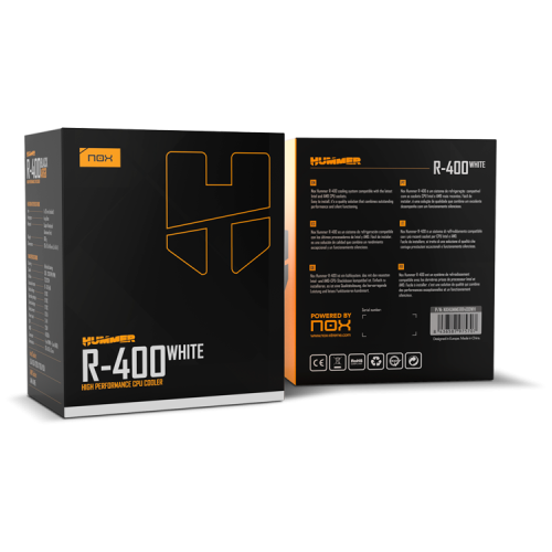 Nox Hummer R-400 es un disipador de CPU con un sobrio y elegante diseño total black/blanco. Incluye un ventilador de 120 mm que proporciona una óptima disipación del calor, velando por mantener la temperatura del interior del PC a niveles bajos.