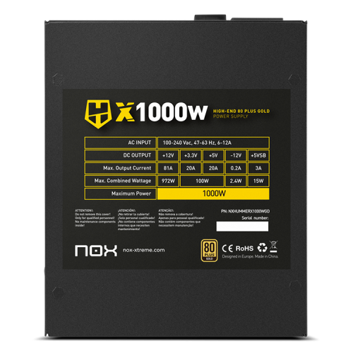 HUMMER X1000 W GOLD EDITIONNox Hummer X 1000W Gold Edition es una fuente diseñada para aquellas configuraciones de altas prestaciones que montan las nuevas tarjetas gráficas. Con Certificación 80 Plus Gold, esta fuente de alimentación completamente modular cuenta con un ultrasilencioso ventilador de 120 mm con regulador de velocidad integrado.CERTIFICACIÓN 80 PLUS GOLDLa fuente de alimentación Nox Hummer X 1000W Gold Edition es una fuente diseñada para tarjetas gráficas de alto consumo. Cuenta con condensadores electrolíticos japoneses de alta gama, unos componentes premium que permiten una potencia real con voltaje estable y fiabilidad en el tiempo**.Construida en materiales de alta calidad, Nox Hummer X 1000W Gold Edition cuenta con Certificación 80 Plus Gold, lo que garantiza una eficiencia mínima del 90 % que ayuda a reducir el consumo eléctrico, contribuyendo al ahorro.POTENCIA ULTRASILENCIOSAEsta fuente de 1000 vatios completamente modular ofrece un gran control del voltaje y un funcionamiento ultrasilencioso. Nox Hummer X 1000W integra un ventilador potente y de baja sonoridad de 120 mm que reduce de manera efectiva el calor y garantiza un rendimiento sobresaliente.El ventilador que integra la fuente de alimentación es un ventilador inteligente que se activa solo cuando es necesario, adaptándose a las diferentes necesidades del equipo.
