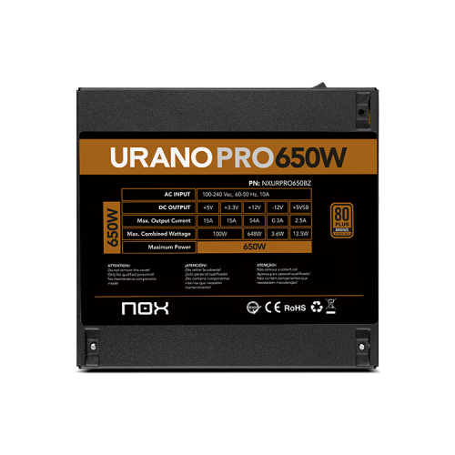 Urano PRO es la nueva serie de fuentes con certificado 80 PLUS Bronze de Nox. Estas fuentes de alimentación han sido diseñadas para garantizar una eficiencia del 85%, brindando una auténtica potencia continua al máximo rendimiento de las configuraciones para entusiastas y profesionales.