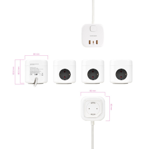 Regleta compacta en formato cubo con 3 enchufes de 16A y 3 puertos USB (2x USB-A + 1x USB-C). Incluye base de sujeción y cinta adhesiva 3M para montaje en pared o escritorio.