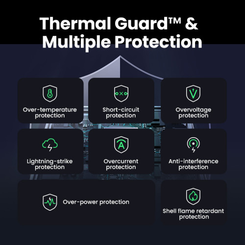 .Seguridad ante todo: Su seguridad y la seguridad de sus dispositivos son nuestra principal prioridad. Es por eso que Ugreen Nexode Air está diseñado para brindar protección confiable contra sobretensiones, sobrecalentamiento, cortocircuitos y otros peligros potenciales, para que pueda estar seguro de que sus dispositivos están completamente seguros. Además, ajusta de forma inteligente la potencia de carga a los dispositivos conectados, garantizando un rendimiento óptimo sin riesgo de daños.