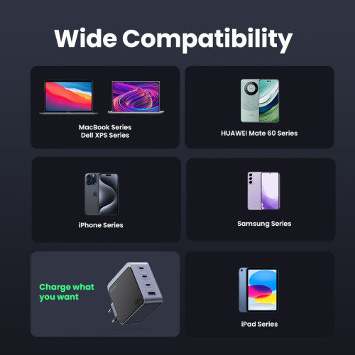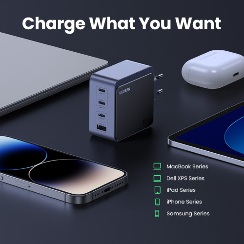 .Hasta 4 puertos USB: ¡Olvídate de tener que elegir entre dispositivos para cargar! Con tres puertos USB-C y un puerto USB, el cargador Ugreen te permite cargar hasta cuatro dispositivos simultáneamente, lo que lo convierte en el compañero perfecto ya sea que estés en la oficina, en casa o mientras viajas.