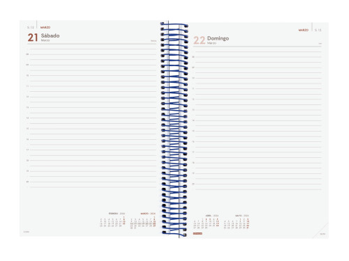 Agenda de espiral de estilo moderno. Con tapas ligeras de polipropileno y goma elástica. Ideal para uso personal y/o profesional. Esquinas microperforadas para localizar rápidamente el día/semana en curso. Agenda con información de interés en la anualidad y otros contenidos extra. Formato profesional de sobremesa que permite guardar papeles DIN A5 o DIN A4 doblados sin que sobresalgan de la agenda. Duración: Enero 2026 – Diciembre 2026 (12 meses). Interior: 1 Día Página. Amplio espacio de escritura para cada día. Con medias horas. Sábados y domingos en página completa. Con información de los festivos de España. La anualidad de la agenda incluye la información relativa a: onomástica, festivos nacionales, cambios de estación e inicios de los años nuevos chino, musulmán, ortodoxo y hebreo. La agenda dispone también de otros contenidos extra: datos personales, horarios, calendarios, planificación anual del año y del año siguiente, festivos internacionales, cómo buscar en Google, usos del teclado, mapa de Europa y de los husos horarios, hojas para notas y hojas para teléfonos, direcciones y e-mails. Idioma del artículo: español. Formato: E11 – 165×242 mm. Tapas de polipropileno, espiral simple metálica y papel. 70 g/m². Papel FSC®.