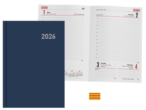 Blanco ecológico de 80 grs .Opaco, satinado. No deja traspasar la tinta.IMPRESIÓN: 2 tintas. CUBIERTA: Tapa rígida forrada. Material papel de encuadernación con cinta de punto de lectura. D/P 5 pag por semana80 grs GRMS CATALAN».