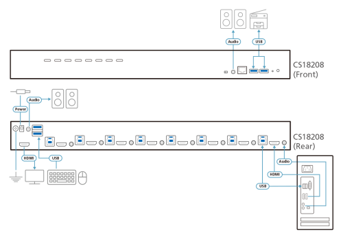 El switch KVM HDMI 4K USB 3.0 de 8 puertos CS18208 de ATEN permite acceder y controlar eficazmente hasta 8 ordenadores con puertos HDMI desde un único teclado o ratón USB o una consola de monitorización con puerto HDMI. El switch CS18208 admite una alta calidad de vídeo de hasta DCI 4K (4096 x 2160 a 60 Hz) y muestra imágenes nítidas.1x switch KVM HDMI 4K USB 3.0 de 8 puertos CS18208 con kit para montaje en rack2x cable HDMI2x cable USB 3.02x cable de audio1x cable de actualización de firmware1x juego de patas (4 unidades)1x adaptador de corriente1x manual de instrucciones