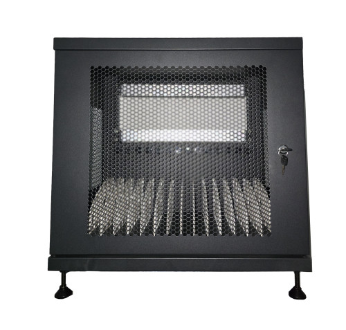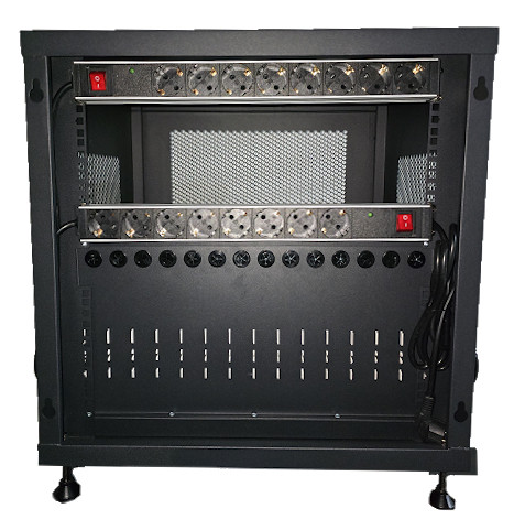 Para garantizar una ventilación óptima, la puerta frontal y el panel trasero están perforados. Además, la seguridad se mejora con una cerradura con llave. Los paneles laterales fijos cuentan con una sección perforada central para facilitar el intercambio de calor y los orificios para el paso de cables están equipados con pasacables de goma. En el interior, un estante con 14 divisores de metal y pasacables permite una gestión ordenada de los cables.