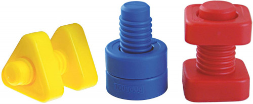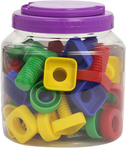 Bote con 38 tornillos y tuercas de gran tamaño, con las 3 formas geométricas básicas: círculo, cuadrado y triángulo, potencían la destreza manual y la coordinación visomotora al enroscar y desenroscar, de plástico muy resistente. Recomendado a partir de 3 años