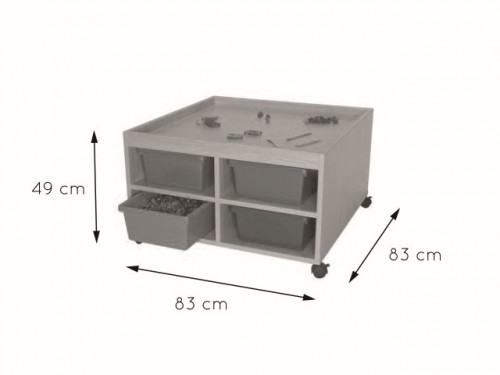 Mueble cuadrado con laterales divididos en 4 casillas con cubetas utilizables para guardar material y parte superior preparada con bordes para ser utilizado por los niños con materiales de manipulación. Fabricado en melamina de haya, con tableros de 19 mm de espesor con cantos de PVC de 2 mm. Ruedas de 6 cm con freno, para evitar la humedad y poder desplazarlo fácilmente. Con bordes redondeados para prevención de cortes o heridas. Incluye 8 cubetas donde poder guardar todos los materiales necesarios para las actividades. Cubetas incluidas.Garantizado por los ensayos realizados en el centro tecnológico de certificación de mobiliario TECNALIA.