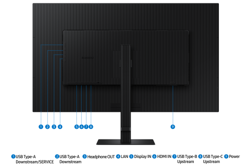 Samsung S80UD. Diagonal de la pantalla: 94 cm (37″), Resolución de la pantalla: 3840 x 2160 Pixeles, Tipo HD: 4K Ultra HD, Tecnología de visualización: LCD, Tiempo de respuesta: 5 ms, Relación de aspecto nativa: 16:9, Ángulo de visión, horizontal: 178°, Ángulo de visión, vertical: 178°. Conector USB incorporado, Versión de conector USB: 3.2 Gen 1 (3.1 Gen 1). montaje VESA, Ajustes de altura. Color del producto: Negro
