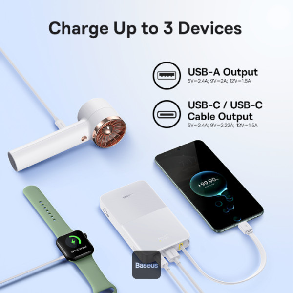 Baseus EnerFill Bipow2 Pro Power Bank 10000 mAh | Carga rápida USB-C PD de 22,5 W | Cable integrado | Pantalla digital | Aprobado para viajar en avión – Blanco