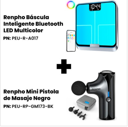 Renpho Balance: Ancho: 28 cm, Alto: 28 cm y Profundidad: 2,5 cm. Bluetooth: Si. Apagado automático. Ahorra energía y prolonga la vida útil del dispositivo con su función de auto apagado. Alta precisión. Sensores de presión avanzados y revestimiento de ITO garantizan mediciones fiables y exactas, con una precisión de hasta 0,2 lb (50 gramos).Mediciones completas. Registra peso corporal, índice de masa corporal (IMC), porcentaje de grasa corporal, masa muscular, masa ósea y tasa metabólica basal para un análisis integral de tu composición corporal .Pantalla LED multicolor. Muestra de forma clara y secuencial el peso, IMC y grasa corporal , aportando un toque moderno y motivador .Plataforma antideslizante. Superficie de vidrio de alta resistencia que ofrece estabilidad y seguridad en cada uso. Sincronización con app Renpho Health. Consulta informes detallados, gráficos de tendencias y haz seguimiento de tus objetivos desde tu móvil .Ideal para todos. Perfecta tanto para quienes desean perder peso, ganar músculo o simplemente cuidar su salud, aportando un diseño vibrante y funcional para hombres y mujeres. Pistola de masaje:15,2l. x 2,5an. x 15,2al. centímetros. 0,68 kg.Pequeña, pero potente: El diseño de tamaño portátil es fácil de transportar y es realmente perfecto para usar en cualquier momento y lugar.Pistola de masaje de bolsillo: Compacta, pero con un peso de solo 0,45 kg (menos de 1 lb), se puede guardar y llevar fácilmente a cualquier lugar. Lleve un masaje de tejido profundo sobre la marcha y durante cualquier situación de la vida diaria: En casa, mientras está viajando, haciendo ejercicio, en la oficina, etc. El controlador de un botón es fácil de usar. Adecuado para el hogar, la oficina, el gimnasio y otras ocasiones.Batería de litio de alta calidad: La intensidad del masaje depende en un 30% de la capacidad de la batería de las pistolas de masaje. A diferencia de la batería de capacidad 1C utilizada tradicionalmente, la mini pistola de masaje RENPHO funciona con una batería de litio 3C mejorada y de alta calidad. Esta batería mejora la experiencia 3 veces para una mejor salida de la energía, una temperatura más baja, estabilidad y seguridad del rendimiento y una vida útil más prolongada del producto.Motor sin escobillas personalizado: El par alto es 1,5 veces mayor que el de mini pistolas de masaje similares en el mercado, lo que significa que la mini pistola de masaje RENPHO no se detendrá fácilmente cuando se encuentre con demasiada presión y resistencia. Asimismo, la vida útil de los motores sin escobillas es más de 10 veces mayor que la de los motores con escobillas. Su mini pistola de masaje RENPHO seguirá siendo potente durante mucho más tiempo que sus competidores Carga el dispositivo, enciéndelo, selecciona un nivel de velocidad y aplícalo a la parte deseada del cuerpo para la relajación muscular.