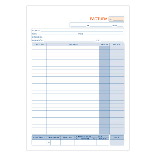 Talonario 50 juegos de formularios tipo FACTURAS (original + copia). Talonarios preimpresos a 2 tintas en papel autocopiativo. Tamaño A4. Duplicado.