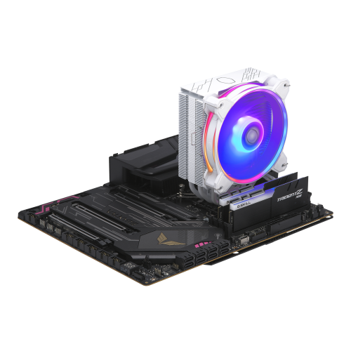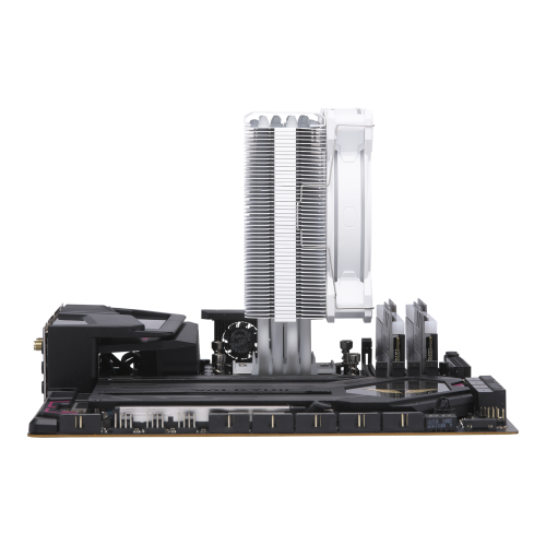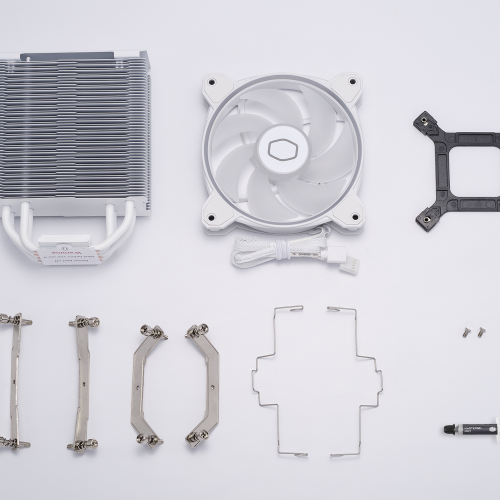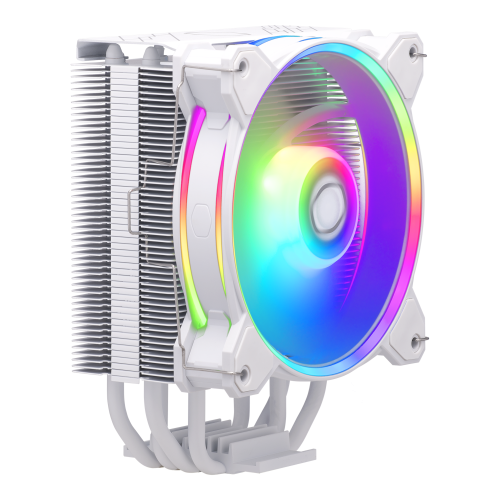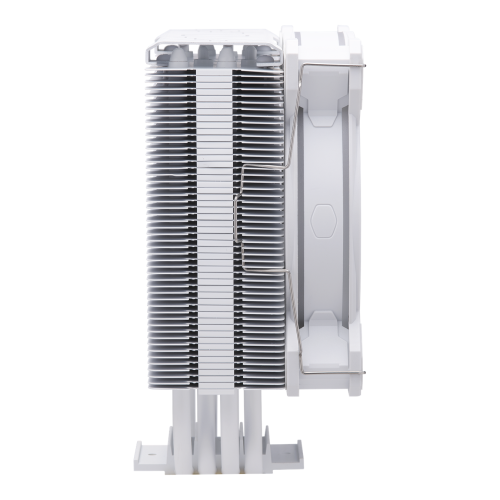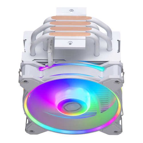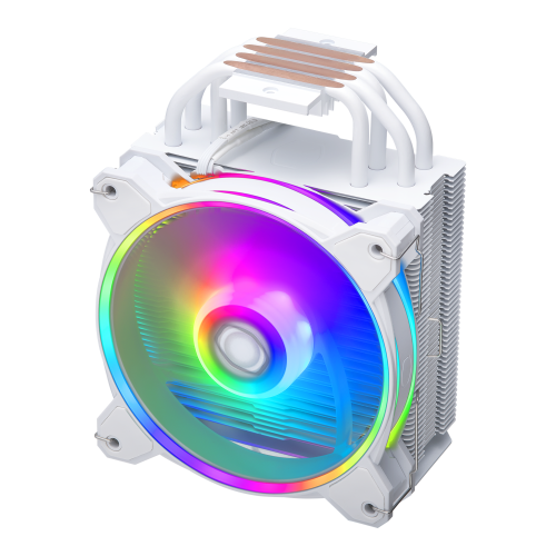 Cooler Master Hyper 212 Halo White. Tipo: Refrigerador de aire, Diámetro de ventilador: 12 cm, Velocidad de rotación (mín.): 650 RPM, Velocidad de rotación (máx.): 2050 RPM, Nivel de ruido (alta velocidad): 27 dB, Máximo flujo de aire: 51,88 cfm, Presión máxima de aire: 2,89 mmH2O, Tipo de soporte: Rodamiento tipo rifle. Ancho: 73 mm, Profundidad: 124 mm, Altura: 154 mm. Color del producto: Blanco
