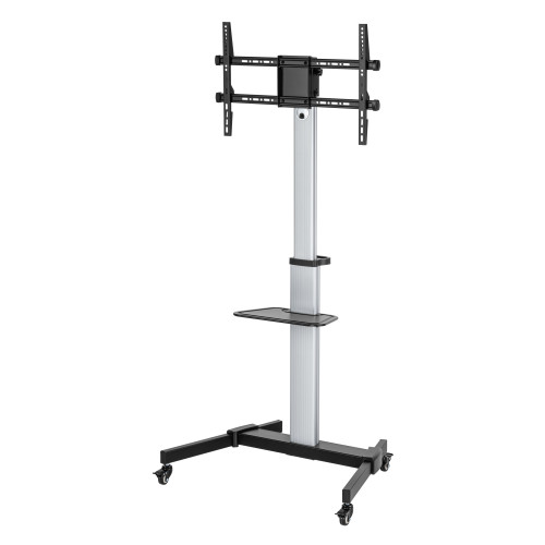 Permite visualizar la pantalla en formato vertical u horizontal gracias a su rotación de hasta 90°, lo que lo hace adaptable a diferentes tipos de presentaciones. El estante ajustable en altura ofrece un espacio útil para almacenar accesorios, y la inclinación sin herramientas (+5°/-10°) permite ajustar fácilmente la posición del televisor.