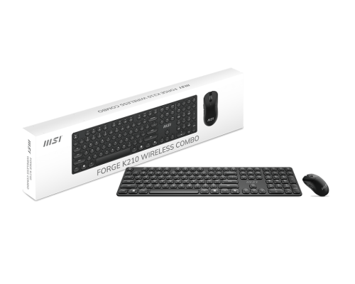 MSI FORGE K210 WIRELESS COMBO. Formato del teclado: Completo (100%), Tecnología de conectividad: Inalámbrico, Interfaz del dispositivo: USB, Interruptor del teclado: Interruptor mecánico, Uso recomendado: Hogar / Oficina. Color del producto: Negro. Ratón incluido