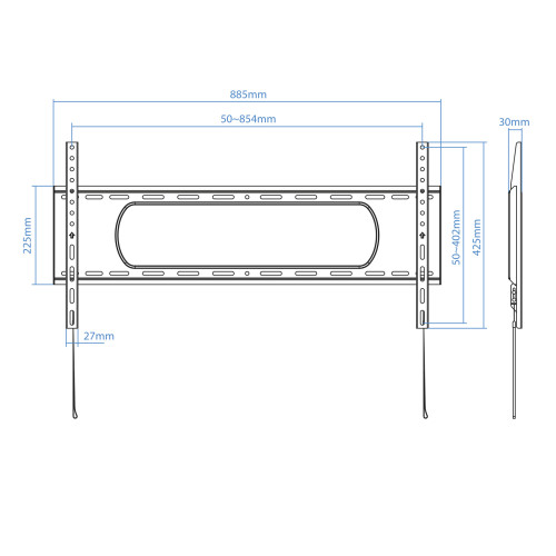 EspecificacionesPantallas soportadas: 43″-90″Compatible con VESA: Mínimo 50×50 Máximo 800x400Peso máximo soportado de pantalla: 80 kgDistancia de pared: 30 mmColor: NegroMaterial: fabricado en acero de alta calidadPeso neto: 0,51 kg. Peso bruto: 0,60 kgMedidas del embalaje: 885x425x35 mm