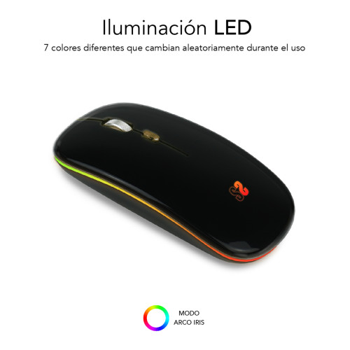 Este ratón es de los más completos del mercado. Es dual, lo que permite conectarlo a dos dispositivos usando la conexión bluetooth o el receptor USB. Incluye la tecnología Silent Click para hacerlo silencioso y útil en entornos con otras personas. Además incluye una iluminación led en 7 colores que irán cambiando aleatoriamente durante su uso para que la experiencia sea inmersiva. La batería es integrada y de larga duración para interferir lo menos posible con tu ritmo de trabajo.Dos conexiones en un mismo ratón. Sin duda estamos ante uno de los ratones más completos del mercado. La tecnología dual permite que podamos conectarlo tanto por radiofrecuencia con un receptor USB como por bluetooth, pudiendo llegar a conectar dos dispositivos.Silent Click. El Led Dual Flat Mouse es silencioso para poder llevarlo a cualquier sitio, desde tu trabajo, un centro de estudio, tu casa. La tecnología Silent Click soluciona el molesto clic repetitivo del ratón que puede llegar a desconcentrarnos, los botones del ratón son silenciosos.Batería Li-ion Recargable. Sin necesidad de pilas, para que te puedas olvidar de ellas. Esta batería de 500 MHa es de larga duración. Además, nunca te quedarás sin ratón porque puedes seguir trabajando mientras se recarga la batería por USB.Rueda metalizada. Disfruta de las mejores sensaciones con la rueda antideslizante de diseño metalizado. Resulta muy cómoda y tiene un tacto agradable.Luz led. El detalle de luz del ratón Led Dual Flat es ideal para completar el diseño de tu escritorio o despacho o incluso para llevártelo a cualquier parte y aportar un toque de color. Resulta ideal para entornos con una baja iluminación gracias a los 7 colores que cambian aleatoriamente mientras se usa creando un entorno relajanteMáxima precisión. Úsalo en múltiples superficies con alto rendimiento y excelentes resultados, adapta la precisión para trabajar a tu gusto. Cuenta con un sensor óptico con precisión láser de 1600 dpi que proporciona un movimiento suave y sin saltos.Ahorro de energía. Después de un tiempo de inactividad, el ratón pasará automáticamente al modo suspensión para ahorrar batería, así no tendrás que preocuparte por encenderlo o apagarlo cada vez que lo uses. Para activarlo, presiona cualquier tecla y vuelve al trabajo.
