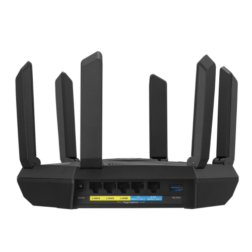 ASUS RT-AXE7800. Tipo de conexión WAN: RJ-45. Banda Wi-Fi: Tribanda (2.4 GHz / 5 GHz / 6 GHz), Estándar Wi-Fi: Wi-Fi 6E (802.11ax), Tasa de transferencia de datos WLAN (máx.): 4804 Mbit/s. Ethernet LAN, velocidad de transferencia de datos: 10,100,1000 Mbit/s, Tecnología de cableado: 10/100/1000Base-T(X), Servidor VPN: IPSec, OVPN, PPTP. Algoritmos de seguridad soportados: SSH, WPA, WPA-Enterprise, WPA2, WPA2-Enterprise, WPA3, WPS, NAT, funcionalidad: PPTP, L2TP, IPSec, RTSP, H.323, SIP Passthrough, PPPoE relay. Tipo de producto: Router de sobremesa, Color del producto: Negro, Indicadores LED: LAN, Poder, WAN