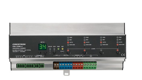 Regulador de intensidad universal de 4 canales, 1 entrada, montaje en riel DIN. 4 canales de atenuación de fase directa o inversa .Detección automática de carga. Funcionamiento de 120 a 240 voltios, 50/60 Hz.