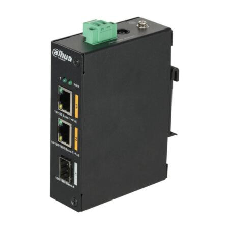 Switch PoE industrial Dahua no gestionable, 2 puertos 100Mbps + 1 puerto SFP Gigabit. Modo CCTV (Cat5 hasta 250m a 10Mbps).El puerto PoE 1 admite 60W. Temperatura de funcionamiento extendida. Watchdog PoE 53V CC..
