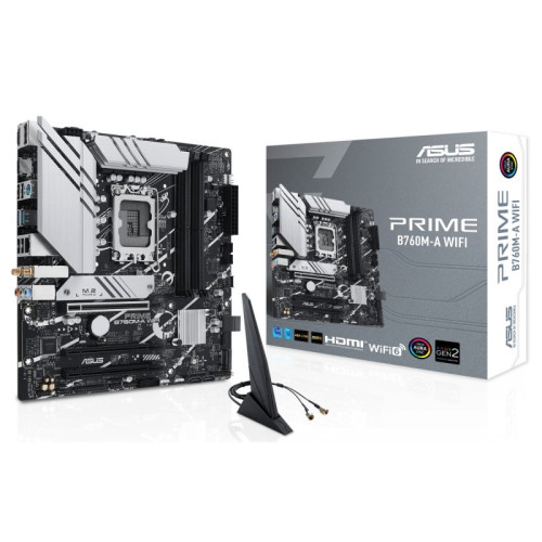 PRIME B760M-A WIFI – Placa base Intel B760 (LGA 1700) mATX con PCIe 4.0, DDR5, 2x M.2, 2.5Gb Ethernet, WiFi 6, DisplayPort, 2x HDMI, SATA 6 Gbps, USB 3.2 Gen 2, USB 3.2 Gen 1 Tipo C, Aura Sync.