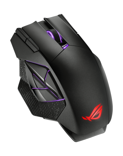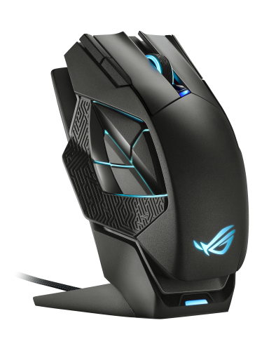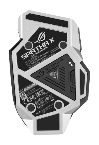 ASUS ROG Spatha X. Factor de forma: mano derecha. Tecnología de detección de movimientos: Óptico, Interfaz del dispositivo: RF Wireless+USB Type-A, Resolución de movimiento: 19000 DPI, Tipo de botones: Botones presionados, Cantidad de botones: 12, Tipo de desplazamiento: Rueda, Aceleración (máx.): 50 G. Iluminación de color: Multi. Fuente de energía: Baterías. Color del producto: Negro
