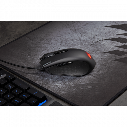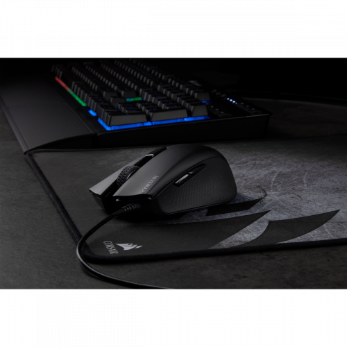 Corsair Harpoon RGB Pro. Factor de forma: mano derecha. Tecnología de detección de movimientos: Óptico, Interfaz del dispositivo: USB tipo A, Resolución de movimiento: 12000 DPI, Tipo de botones: Botones presionados, Cantidad de botones: 6, Tipo de desplazamiento: Rueda. Iluminación de color: Rojo/Verde/Azul. Fuente de energía: Cable. Color del producto: Negro