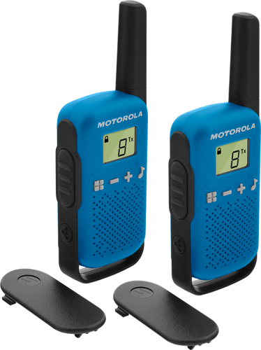 - Tipo de visualizador: LCD - Peso: 79 g - Ancho: 48 mm - Profundidad: 27 mm - Altura: 136 mm - Indicación de batería baja: Si - Bloqueo del teclado: Si - Color del producto: Negro, Azul - Pinza para cinturón: Si - Cantidad: 2 - Alcance máximo: 4000 m - Número de canales (total): 16 canales