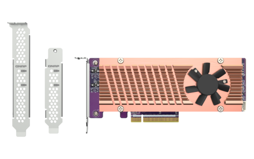 - Interfaz de host: PCIe - NVMe: Si - Estándar de la tarjeta de expansión: PCIe 3.0 - Interfaz de salida: M.2 - Profundidad: 170,5 mm - Ancho: 68,9 mm - Altura: 19,3 mm - Interfaz: PCIe Gen3 x 8 - Número de ranuras de expansión: 2 - Utilizar con: NAS / Storage server - Color del producto: Marrón, Gris - Interno: Si - Tipo de enfriamiento: Activo - Indicadores LED: Si - Número de ventiladores: 1 Ventilador(es) - Tasa de transferencia de datos (max): 32 Gbit/s - Cantidad por paquete: 1 pieza(s)