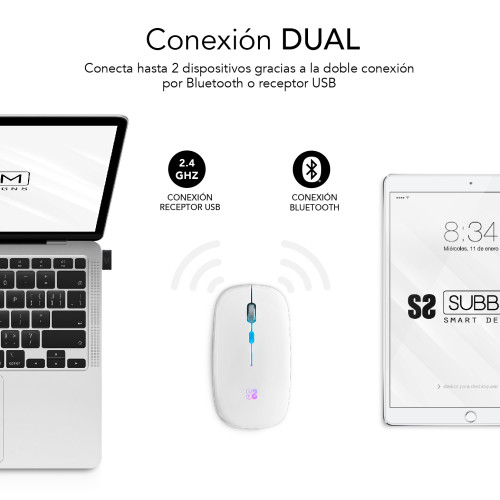 Este ratón es de los más completos del mercado. Es dual, lo que permite conectarlo a dos dispositivos usando la conexión bluetooth o el receptor USB. Incluye la tecnología Silent Click para hacerlo silencioso y útil en entornos con otras personas. Además incluye una iluminación led en 7 colores que irán cambiando aleatoriamente durante su uso para que la experiencia sea inmersiva. La batería es integrada y de larga duración para interferir lo menos posible con tu ritmo de trabajo.Dos conexiones en un mismo ratón. Sin duda estamos ante uno de los ratones más completos del mercado. La tecnología dual permite que podamos conectarlo tanto por radiofrecuencia con un receptor USB como por bluetooth, pudiendo llegar a conectar dos dispositivos.Silent Click. El Led Dual Flat Mouse es silencioso para poder llevarlo a cualquier sitio, desde tu trabajo, un centro de estudio, tu casa. La tecnología Silent Click soluciona el molesto clic repetitivo del ratón que puede llegar a desconcentrarnos, los botones del ratón son silenciosos.Batería Li-ion Recargable. Sin necesidad de pilas, para que te puedas olvidar de ellas. Esta batería de 500 MHa es de larga duración. Además, nunca te quedarás sin ratón porque puedes seguir trabajando mientras se recarga la batería por USBRueda metalizada. Disfruta de las mejores sensaciones con la rueda antideslizante de diseño metalizado. Resulta muy cómoda y tiene un tacto agradable.Luz led. El detalle de luz del ratón Led Dual Flat es ideal para completar el diseño de tu escritorio o despacho o incluso para llevártelo a cualquier parte y aportar un toque de color. Resulta ideal para entornos con una baja iluminación gracias a los 7 colores que cambian aleatoriamente mientras se usa creando un entorno relajanteMáxima precisión. Úsalo en múltiples superficies con alto rendimiento y excelentes resultados, adapta la precisión para trabajar a tu gusto. Cuenta con un sensor óptico con precisión láser de 1600 dpi que proporciona un movimiento suave y sin saltos.Ahorro de energía. Después de un tiempo de inactividad, el ratón pasará automáticamente al modo suspensión para ahorrar batería, así no tendrás que preocuparte por encenderlo o apagarlo cada vez que lo uses. Para activarlo, presiona cualquier tecla y vuelve al trabajo.